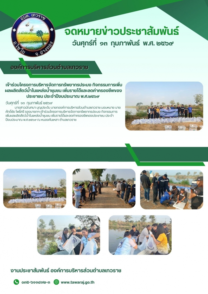 เข้าร่วมโครงการบริหารจัดการทรัพยากรประมง กิจกรรมการเพิ่มผลผลิตสัตว์น้ำในแหล่งน้ำชุมชน เพิ่มรายได้และลดค่าครองชีพของประชาชน ประจำปีงบประมาณ พ.ศ.๒๕๖๙...