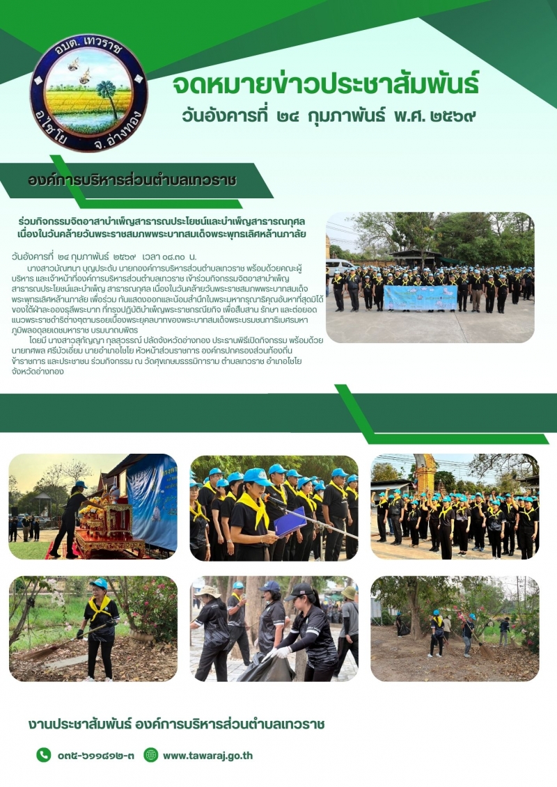 นางสาวมัณฑนา บุญประดับ นายกองค์การบริหารส่วนตำบลเทวราช พร้อมด้วยคณะผู้บริหาร และเจ้าหน้าที่องค์การบริหารส่วนตำบลเทวราช เข้าร่วมกิจกรรมจิตอาสาบำเพ็ญสาธารณประโยชน์และบำเพ็ญสาธารณกุศล เนื่องในวันคล้ายวันพระราชสมภพพระบาทสมเด็จพระพุทธเลิศหล้านภาลัย เพื่อร่วมกันแสดงออกและน้อมสำนึกในพระมหากรุณาธิคุณอันหาที่สุดมิได้ของใต้ฝ่าละอองธุลีพระบาท ที่ทรงปฏิบัติบำเพ็ญพระราชกรณียกิจ เพื่อสืบสาน รักษา และต่อยอดแนวพระราชดำริต่างๆตามรอยเบื้องพระยุคลบาทของพระบาทสมเด็จพระบรมชนกาธิเบศรมหาภูมิพลอดุลยเดชมหาราช บรมนาถบพิตร