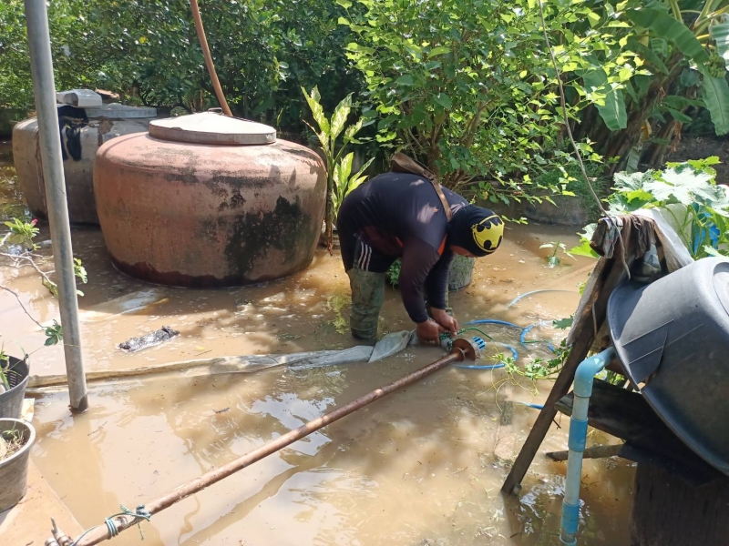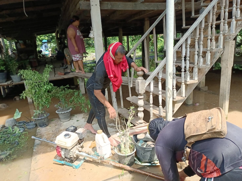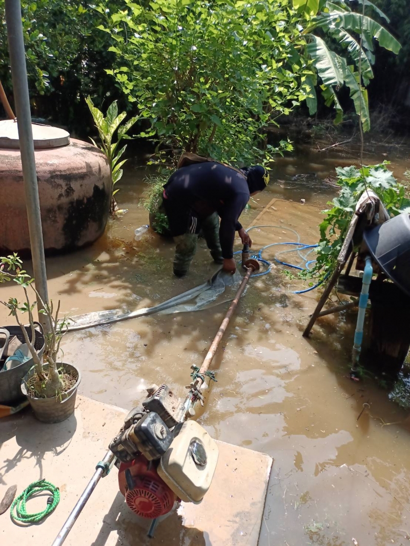 ลงพื้นที่ดำเนินการสูบน้ำท่วมขังบ้านเรือนประชาชน บริเวณ หมู่ที่ 1 ตำบลเทวราช