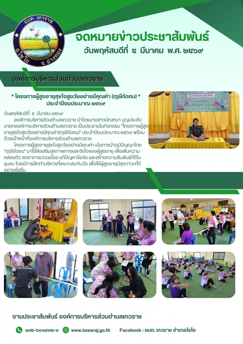 องค์การบริหารส่วนตำบลเทวราช นำโดยนางสาวมัณฑนา บุญประดับ นายกองค์การบริหารส่วนตำบลเทวราช เป็นประธานในกิจกรรม "โครงการผู้สูงอายุสุขใจสูงวัยอย่างมีคุณค่า(ฤาษีดัดตน)" ประจำปีงบประมาณ ๒๕๖๙ พร้อมด้วยเจ้าหน้าที่องค์การบริหารส่วนตำบลเทวราช